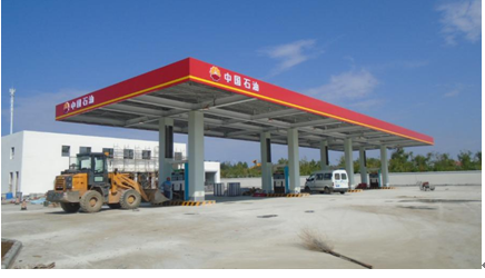 3)新建型钢结构罩棚1座,水平投影面积550.4㎡(含包装),钢柱净空高度5.5m;新建4座加油岛,配套防撞柱8个;新建4台四枪四油品潜油泵加油机(设1把大流量柴油枪,汽油机为油气回收型);新建成品防渗加油机底座。