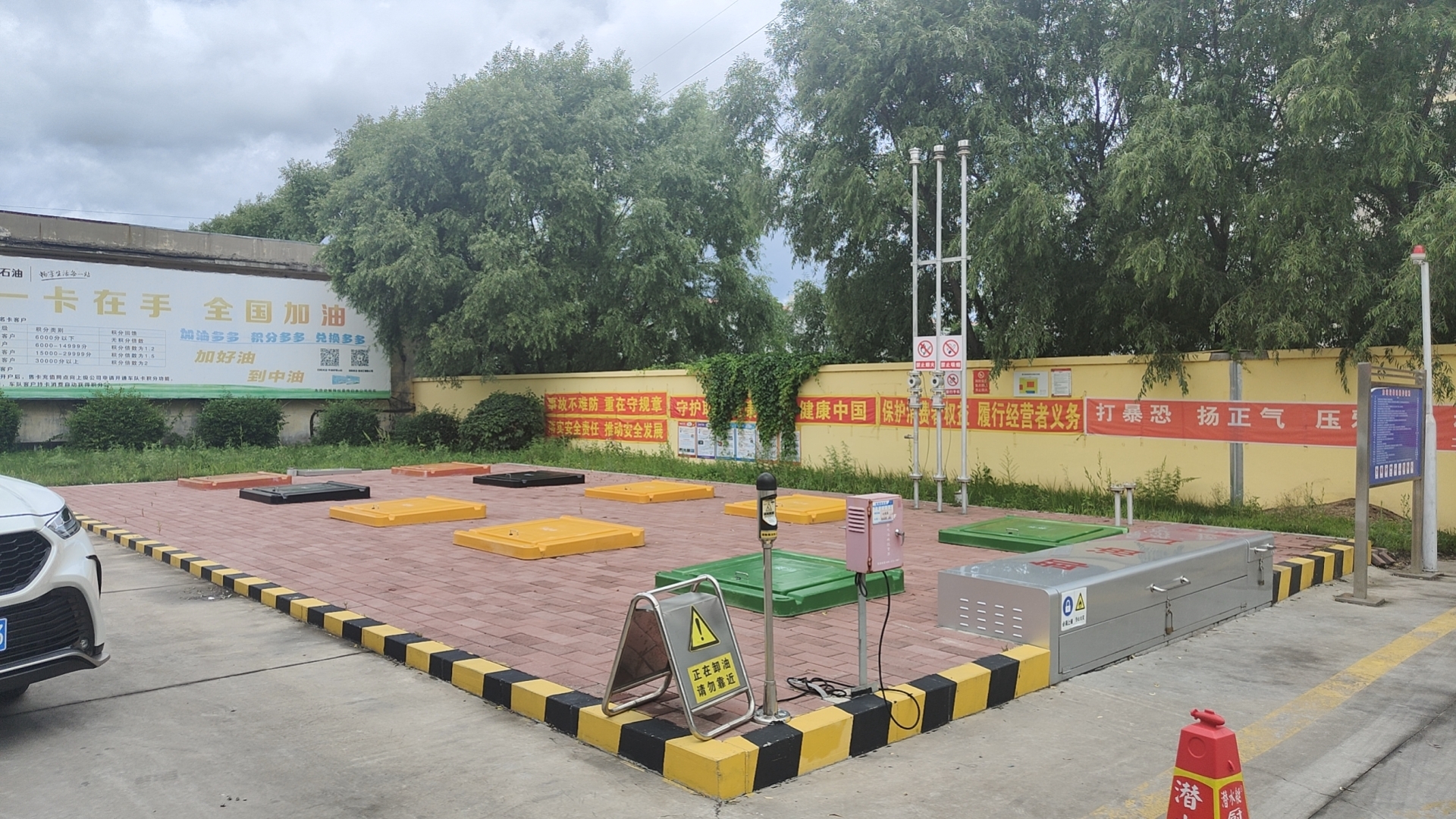 中国石油天然气股份有限公司黑龙江鹤岗销售分公司富力加油站罐区为地下储罐区,采用双层油罐的防渗措施。油罐人孔操作井采用混凝土防渗操作井,卸油口井采用混凝土防渗操作井。共设有5个埋地卧式油罐,其中柴油储罐1座,单罐容积均为30m3;汽油储罐4座,单罐容积均为30m3。总容积150m3,根据《汽车加油加气站设计与施工规范》GB50156-2012(2014年版)第3.0.9条要求,按柴油储罐容积折半计算为135m3,属于二级加油站。站内设有4台加油机,其中汽油加油机3台,柴油加油机1台,加油机底槽采用混凝土防渗底槽。站内设有分散式汽油加油油气回收系统和汽油卸油油气回收系统。