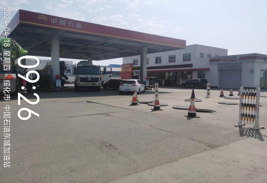 中国石油天然气股份有限公司黑龙江绥化望奎经营部东城加油站罐区为地下储罐区,采用双层储罐防渗漏措施。共设有4个埋地卧式油罐,其中柴油储罐2座,单罐容积均为50m3;汽油储罐2座,单罐容积为50m3。总容积200m3,根据《汽车加油加气加氢站技术标准》GB50156-2021第3.0.9条要求,按柴油储罐容积折半计算为150m3,属于二级加油站。站内设4台潜油泵加油机,其中2台四枪三油品潜油泵汽柴油加油机,2台双枪双油品潜油泵柴油加油机,站内设有分散式汽油加油油气回收系统和汽油卸油油气回收系统。